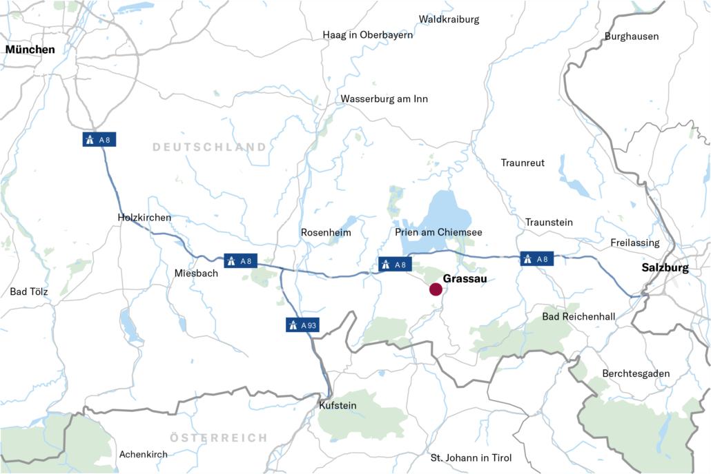 Der Luftkurort Grassau liegt eingebettet zwischen den Chiemgauer Alpen und dem Chiemsee. Mit den eingegliederten Ortsteilen Rottau und Mietenkam leben hier ca. 7.300 Menschen. Man findet in Grassau auch ein sehr gesundes und abwechslungsreiches Bioklima. Die Wetterverhältnisse, kühle Nächte und warme – aber nicht zu heiße – Tage und ständig frische Luft durch Bergwinde, bieten das Fundament für Ruhe und Gesundheit. Grassau besticht außerdem durch eine ausgezeichnete Lage. Durch die Verkehrsanbindung über die Autobahn A8 München-Salzburg ist Grassau hervorragend erreichbar. Nach München fährt man nur eine Stunde mit dem Auto, nach Salzburg sind es lediglich 45 Minuten Fahrzeit.